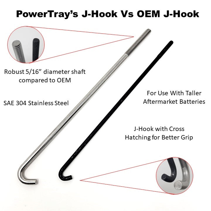 PowerTray's J-hooks are custom made in America to our specifications. They feature high quality SAE 304 stainless steel, so there is never a worry about rust or battery corrosion. PowerTray's J-hooks are also much larger then OEM J-hooks, with a 5/16" diameter shaft compared to the OEM's, which are an M6 thread. The hook itself features a cross hatch pattern which allows for a better grip on the vehicle's body. We also include locking serrated flange nuts to securely fasten the PowerTray Dual Circuit Breaker Battery Tie Down to your vehicle.