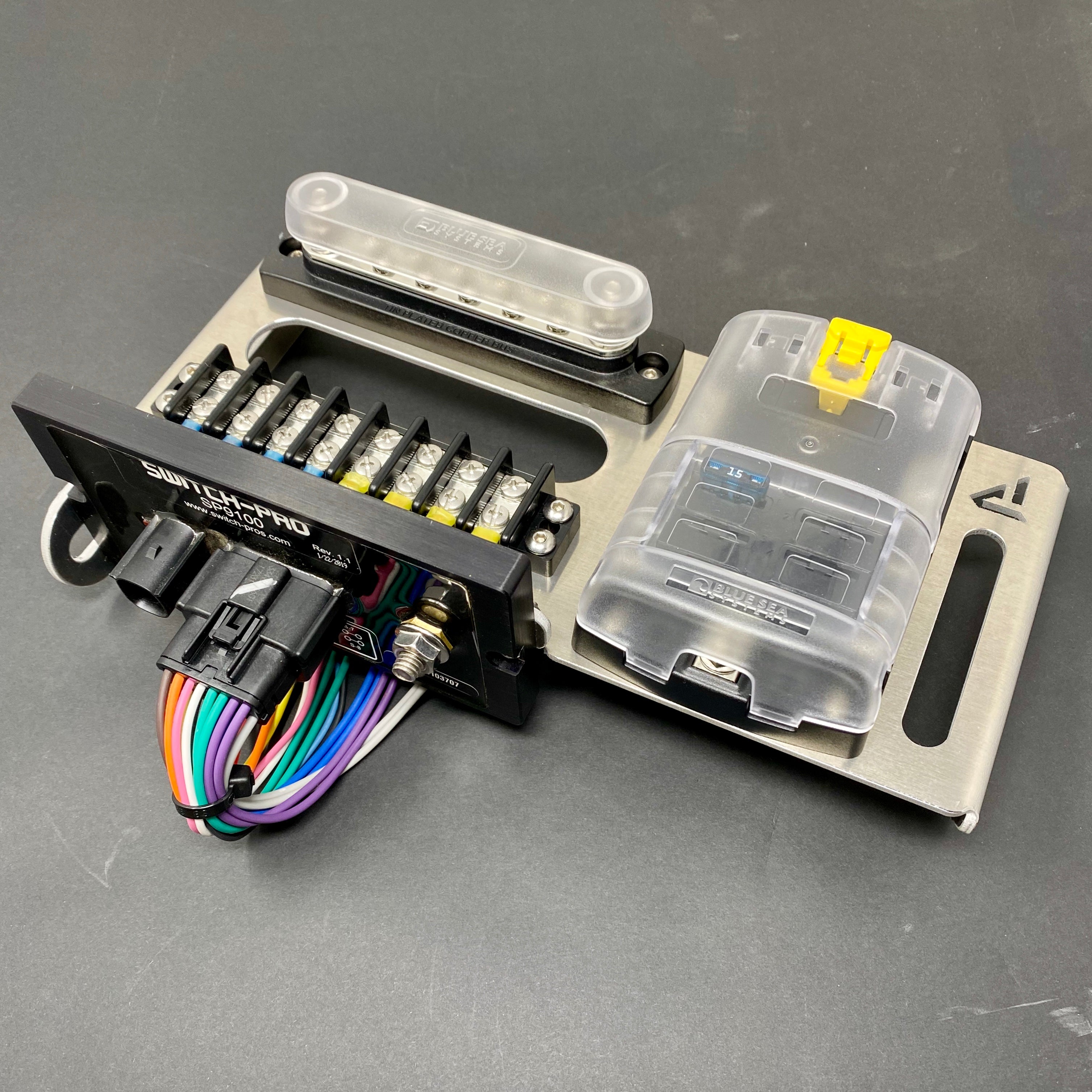 This option is the same as the Original Switch-Pros PowerTray seen above, minus the fuse block. Its a simple, compact solution to mount your Switch-Pros system and the Blue Sea terminal block and busbar so you can keep your wiring clean and organized.